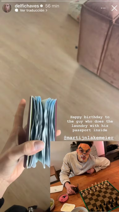 En las últimas horas Delfina acudió a su cuenta de Instagram para dedicarle un tierno mensaje a su novio por su cumpleaños. Para esto publicó un video que incluía un pasaporte mojado y una foto de Martijn con una mascarilla hidratante mientras jugaba al ajedrez.
