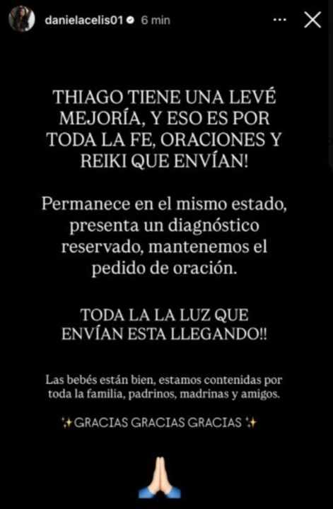 «Tiene una leve mejoría y eso es por toda la fe, oraciones y reiki que le envían. Permanece en el mismo estado y presenta diagnóstico reservado«, detalló Daniela.