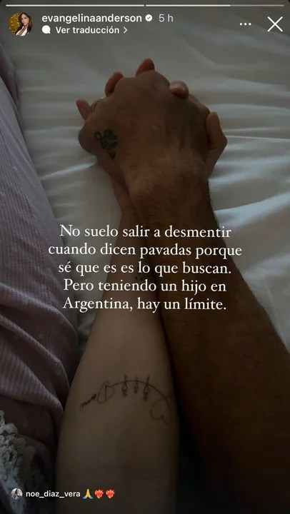 “No suelo salir a desmentir cuando dicen pavadas porque sé que es lo que buscan. Pero, teniendo un hijo en Argentina hay un límite”, escribió Anderson junto a una foto de ella y Demichelis agarrados de la mano.