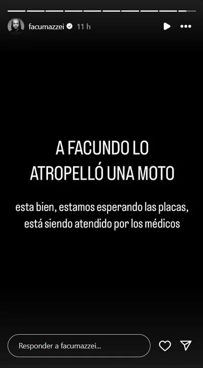 “A Facundo lo atropelló una moto”, reveló su cuenta oficial de Instagram. Y agregó: “Está bien, estamos esperando las placas, está siendo atendido por los médicos”.