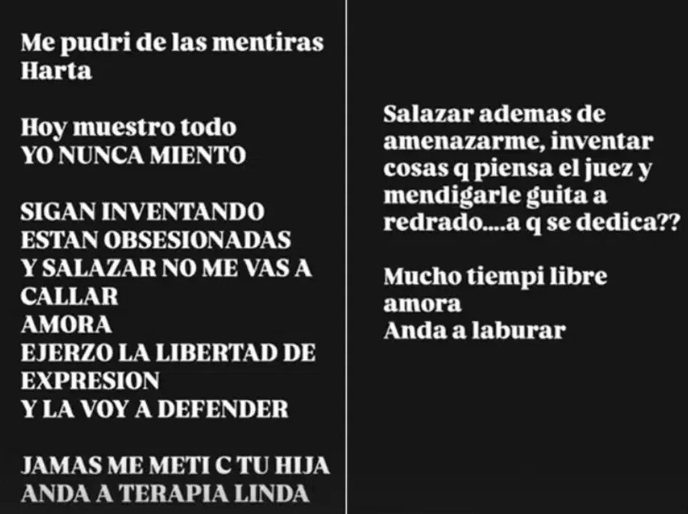 Finalmente, la modelo cerró con un mensaje desafiante: “Ella dice que nunca se metió conmigo. La Justicia dice otra cosa. Y seguí hostigando y hablando mal de mí, que no te tengo nada de miedo. Al contrario, que alguien como vos hable mal de mí quiere decir que estoy haciendo todo bien”.
