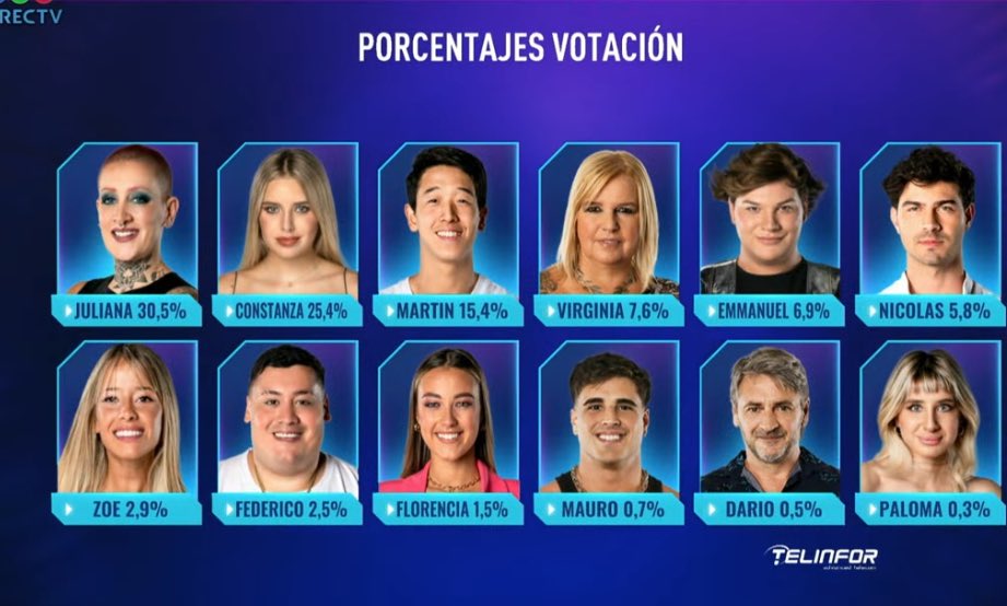 Luego de la salida de Paloma, el conductor de Gran Hermano mostró cuáles fueron los porcentajes de esta placa positiva. Una vez más quienes lideran la lista son Juliana «Furia» con el 30,5% y Coty con el 25,4%.
