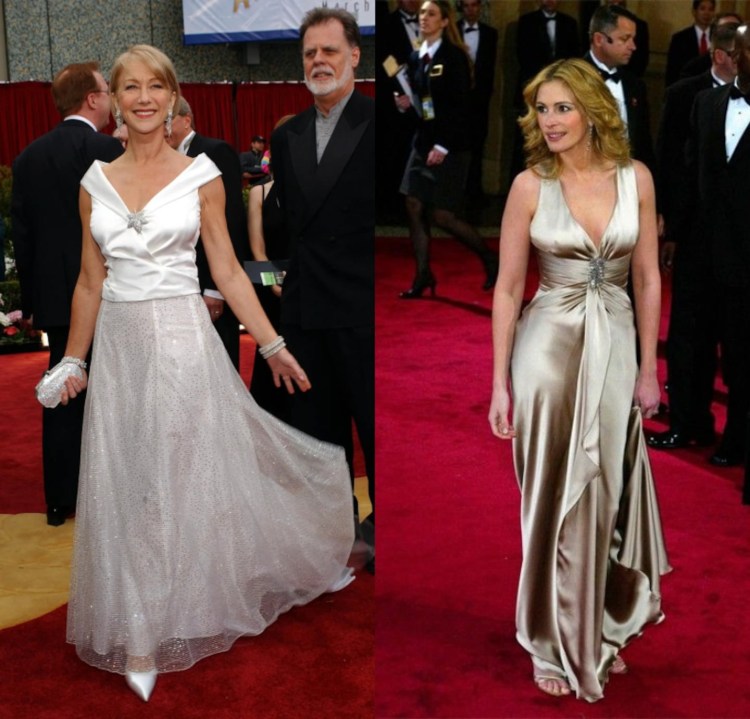 - Helen Mirren: en 2002 lució un Armani denominado por la crítica como “Street Style”, con un aire nupcial que llamó poderosamente la atención. Un estilo similar eligió Julia Roberts en 2004, pero en un tono cobrizo.