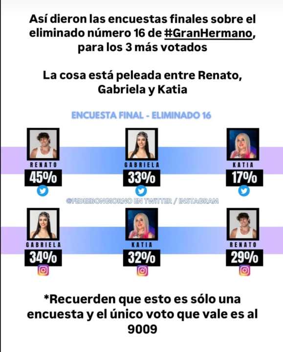 Fefe Bongiorno, uno de los referentes en el análisis del programa, lanzó sus encuestas en Twitter e Instagram, y los resultados muestran una pelea reñida. En Twitter, Renato Rossini, el participante peruano, encabeza la lista de los más votados para abandonar la casa con un 45%. Lo sigue de cerca Gabriela Gianatassio, la jugadora brasileña que lleva pocos días en el juego, con un 33%. En tercer lugar aparece Katia «La Tana» Fenocchio, quien parece zafar con un 17% de votos negativos.