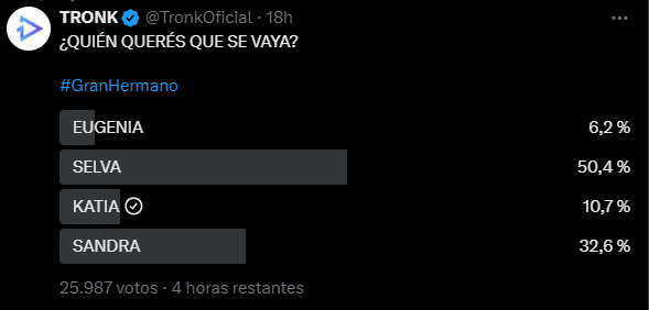 En una placa negativa, donde el participante con mayor rechazo del público abandonará la casa, las encuestas marcan una clara tendencia. Según la encuesta de Fefe Bongiorno, los resultados son: