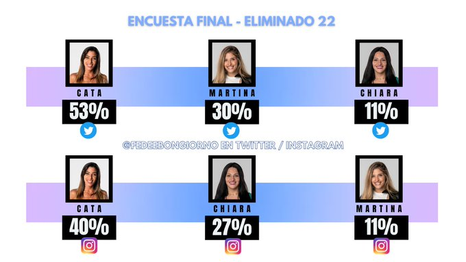Desde la cuenta de @fedeebongiorno, integrante de LAM (América TV), se realizó una encuesta donde votaron más de 30.000 personas. Según el público, la próxima eliminada sería Catalina con el 53%. En segundo lugar, estaría Martina con el 30% y la seguiría Chiara con el 27%.