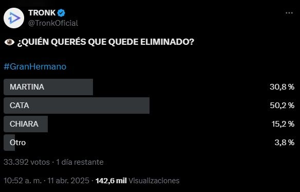 Según la encuesta de @TronkOficial donde votaron más de 33.000 personas, Catalina también sería la próxima eliminada. Martina tendría el 30,8% de los votos, mientras que Chiara seguiría en la casa con el 15,2%.