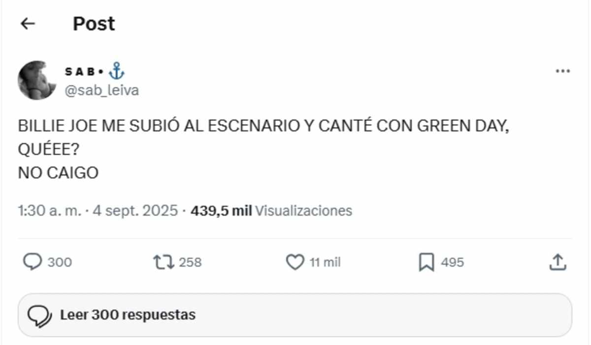 La joven fue invitada al escenario mientras sonaba «Know Your Enemy» y su ídolo le regaló la icónica corbata roja para luego cederle el micrófono. Emocionada, la fan cantó y pudo ver desde el escenario a las miles de personas que pogueaban al son de Green Day: «No caigo», expresó la joven a través de X.