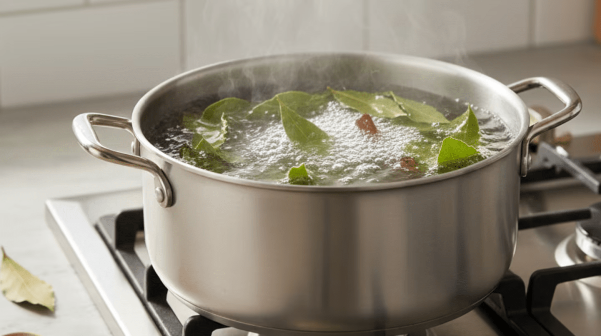 • Colocá 3 o 4 hojas de laurel y 1 o 2 ramas de canela en una cacerola con agua.