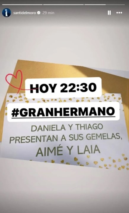 Así, Santiago del Moro subió una historia en su Instagram develando el secreto de lo que sucederá este lunes en la Gala de Gran Hermano, donde además se espera la presencia de Sabrina, quien salió de la Casa este domingo por decisión de la gente.