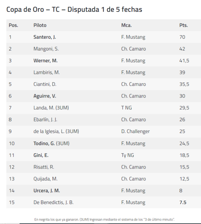 La tabla de posiciones de la Copa de Oro del Turismo Carretera