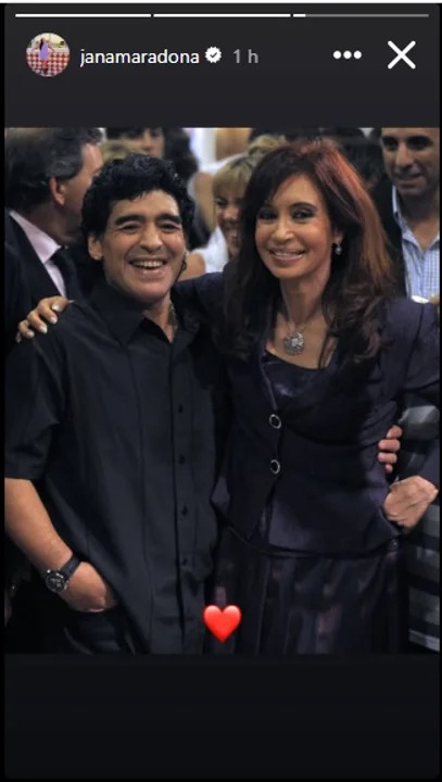 En sus historias de Instagram en donde cuenta con más 300 mil seguidores, la maquilladora e hija del 10 compartió una imagen del histórico deportista junto a la ex jefa de Estado. Allí se los puede ver hace más de 15 años con una gran sonrisa. Al pie de la imagen, Jana añadió un corazón rojo.