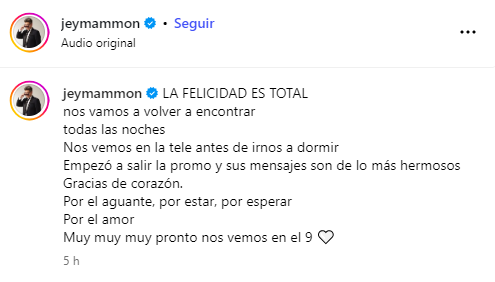 «Muy muy muy pronto nos vemos en El Nueve«, concluyó Jey Mammón al anunciar su vuelta a la pantalla chica, aún sin fecha de estreno.