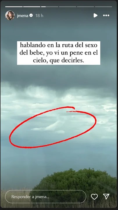 Con el humor que la caracteriza, la influencer compartió una historia con la impensada señal que recibió mientras conducía con su pareja camino a Quequén: “Hablando en la ruta del sexo del bebé, yo vi un pene en el cielo, qué decirles”, escribió junto a una imagen de lo que vio.