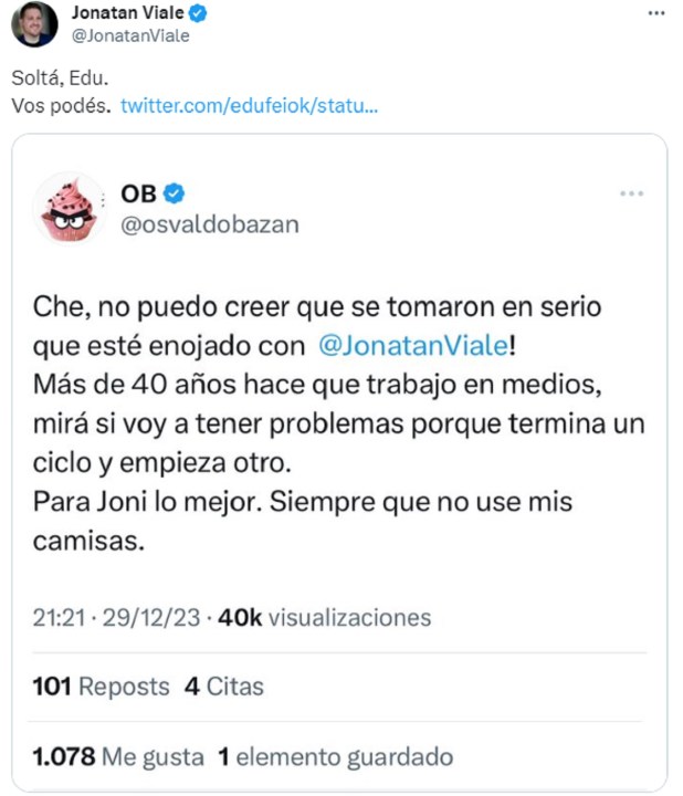 Entonces, fue Osvaldo Bazán quien debió aclarar todo: «Che, no puedo creer que se tomaron en serio que esté enojado con Jonatan Viale. Más de 40 años hace que trabajo en medios, mirá si voy a tener problemas porque termina un ciclo y empieza otro. Para Joni lo mejor. Siempre que no use mis camisas».