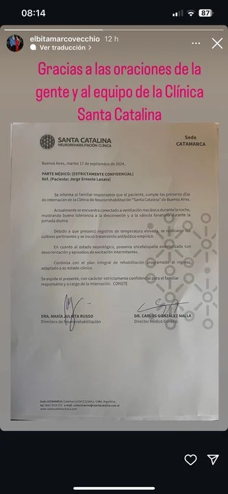 Elba Marcovecchio compartió el documento en sus historias de Instagram agradeciendo al equipo de la Clínica y a todos los que oran por la pronta recuperación del periodista: “Gracias a las oraciones de la gente y al equipo de la clínica Santa Catalina”.