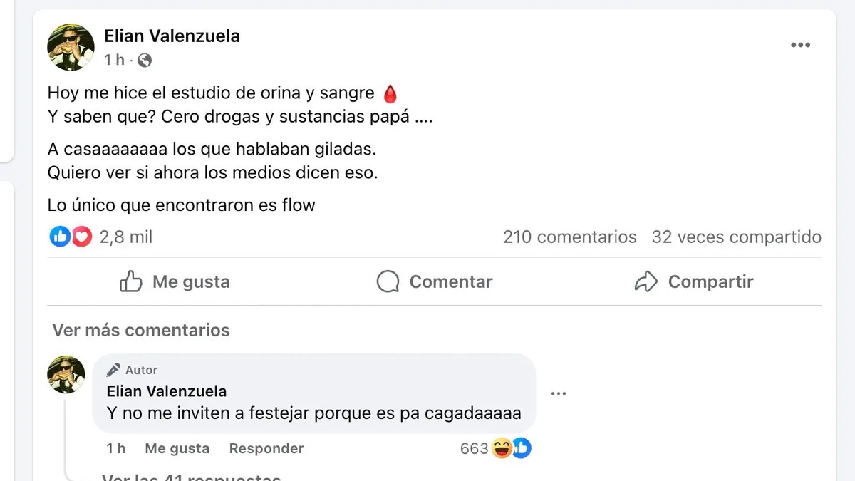 «Hoy me hice el estudio de orina y sangre. ¿Y saben qué? Cero drogas y sustancias papá. A casaaaaaaaa los que hablaban giladas. Quiero ver si ahora los medios dicen eso. Lo único que encontraron es flow», expresó.