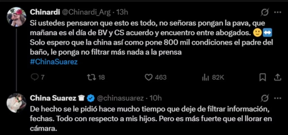 Suárez respondió a un comentario de un usuario que señalaba que, si bien ella ponía “800 mil condiciones”, esperaba que Vicuña dejara de filtrar información sobre los hijos a la prensa. A ese comentario la China contestó: “Se le pidió hace mucho tiempo que deje de filtrar información, fechas y todo con respecto a mis hijos. Pero es más fuerte que él llorar en cámara”.