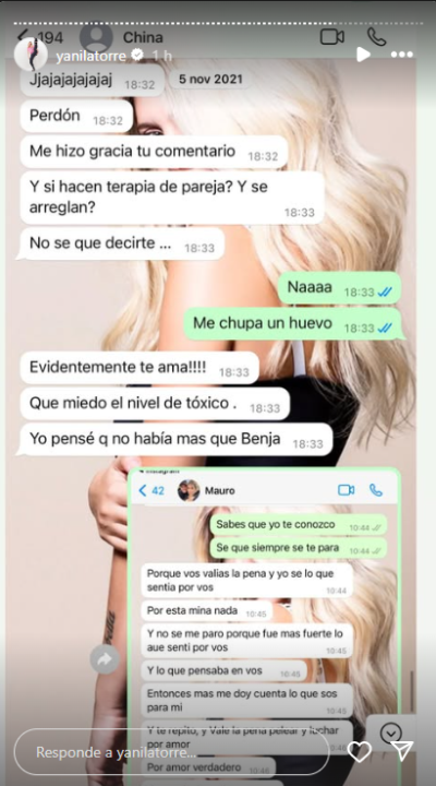 En uno de los chats que Yanina Latorre reveló en sus historias de Instagram, la modelo le recomendaría a la conductora "hacer terapia".