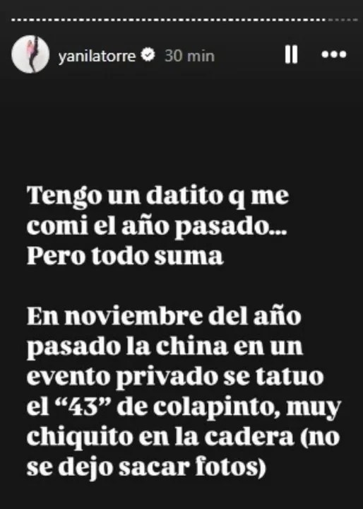 «Tengo un datito que me comí el año pasado… pero todo suma. En noviembre del año pasado, la China se tatuó en un evento privado el ’43’ de Franco Colapinto, muy chiquito en la cadera. No dejó que le sacaran fotos», escribió en su cuenta de Instagram la panelista de LAM.
