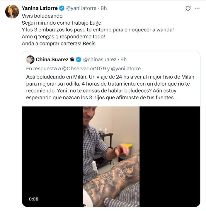“Vivís boludeando. Seguí mirando como trabajo Euge. Y los 3 embarazos los paso tu entorno para enloquecer a Wanda! Amo q tengas q responderme todo! Anda a comprar carteras! Besis”, cerró.