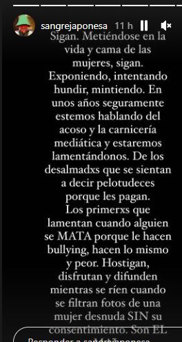 La actriz escribió un texto en letras blancas sobre un fondo negro y sin otro aditivo más que las palabras. “Sigan. Metiéndose en la vida y cama de las mujeres, sigan. Exponiendo, intentando, hundir, mintiendo. En unos años seguramente estemos hablando del acoso y la carnicería mediática, y estaremos lamentándonos. De los desalmadxs que se sientan a decir pelotudeces porque les pagan. Los primerxs que lamentan cuando alguien se mata porque le hacen bullying, hacen lo mismo y peor. Hostigan, disfrutan y difunden mientras se ríen cuando se filtran fotos de una mujer desnuda sin su consentimiento. Son el mal”.