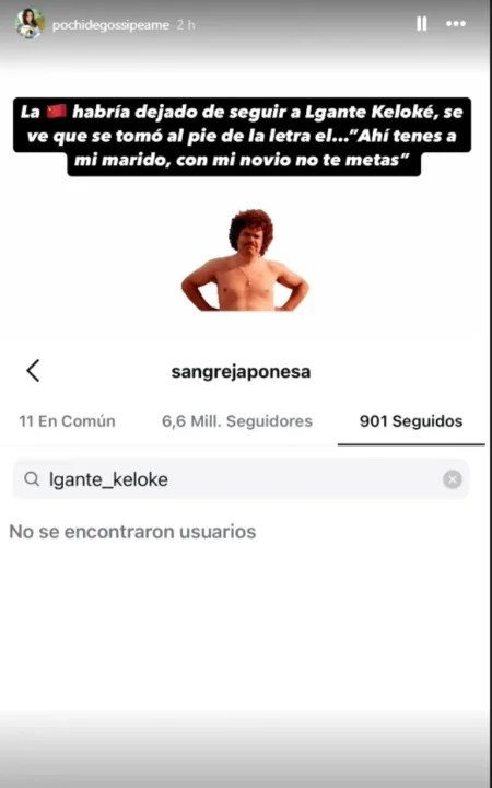 “La China habría dejado de seguir a L-Gante, se ve que se tomó al pie de la letra el ‘ahí tenés a mi marido, con mi novio no te metés’”, comentó Pochi de Gossipeame en sus historias de Instagram.