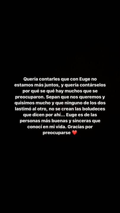 “Quería contarles que con Euge no estamos más juntos, y quería contárselos porque sé que hay muchos que se preocuparon. Sepan que nos queremos y nos quisimos mucho y que ninguno de los dos lastimó al otro, no se crean las boludeces que dicen por ahí. Euge es de las personas más buenas y sinceras que conocí en mi vida. Gracias por preocuparse”, señaló el músico en una historia.