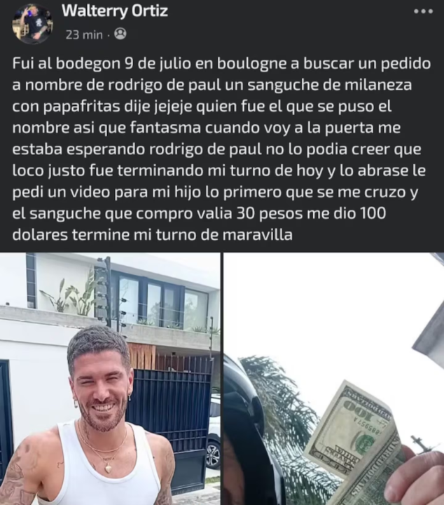 El protagonista de esta historia es Walter Ortiz, un repartidor de pedidos que tuvo un encuentro viral con Rodrigo De Paul. El futbolista de la Selección argentina realizó un enorme gesto con el delivery: pagó con 100 dólares y le dijo que se quede con el vuelto.