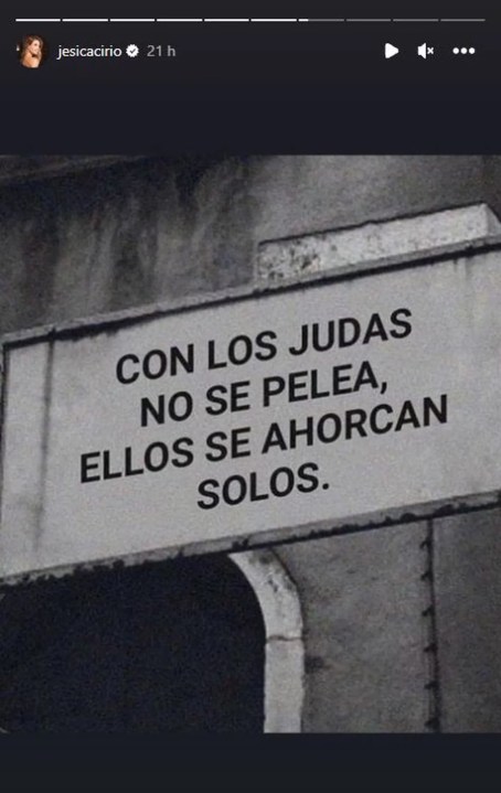 “Con los Judas no se pelea, ellos se ahorcan solos”, rezaba el posteo que Jesica compartió en una historia, mientas que algunas horas después, publicó una foto junto a su hija Chloe, fruto de su relación de más de 10 años con Insaurralde.