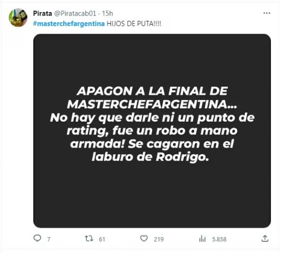 Por eso, algunos indignados propusieron realizar un «apagón a la final de MasterChef Argentina«.