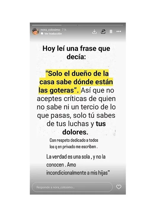 “Con respeto, dedicado a todos los que me escriben. La verdad es una sola, y no la conocen. Amo incondicionalmente a mis hijas”, aseguró Nora Colosimo.