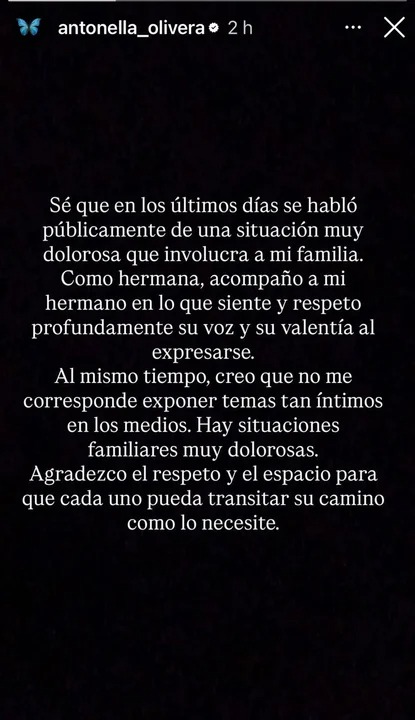 «Al mismo tiempo, creo que no me corresponde exponer temas tan íntimos en los medios. Hay situaciones familiares muy dolorosas. Agradezco el respeto y el espacio para que cada uno pueda transitar su camino como lo necesite», finalizó Antonella en su descargo.