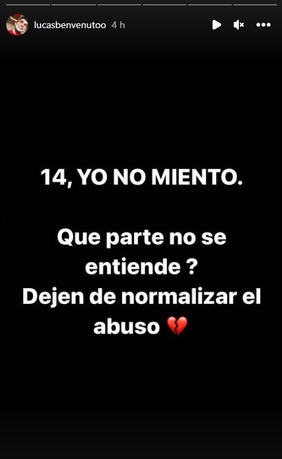 Así es que Benvenuto volvió a expresarse en las historias de Instagram, tal como había hecho ayer, y señaló: «14, yo no miento. Qué parte no se entiende? Dejen de normalizar el abuso» sobre un fondo negro.