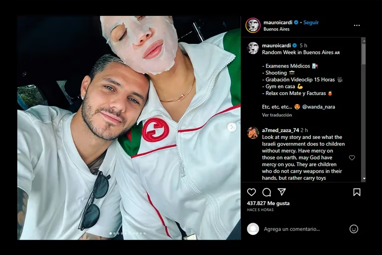 “Random Week in Buenos Aires. Exámenes Médicos. Shooting, Grabación Videoclip 15 horas. Gym en casa. Relax con mate y facturas. Etc., etc., etc…”, escribió junto a un emoji de cara con ojitos de corazones y arrobando a Nara, junto a una serie de fotos.