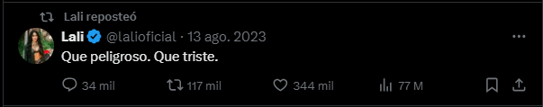 “Qué peligroso. Qué triste”, fue el mensaje que escribió Lali en ese momento y que ahora decidió repostear, en clara posición respecto del fallo de la Corte que confirmó la condena a la ex presidenta.