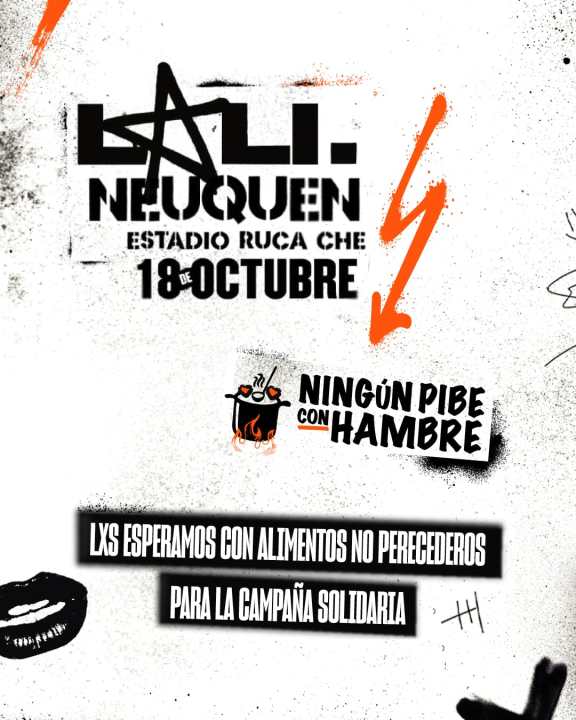 El show de Lali en el Ruca Che tendrá su apertura de puertas a las 20, pero previo al recital, se organizará una colecta de alimentos no perecederos. Se trata de la compaña solidaria «Ningún pibe con hambre» que acompaña la artista».