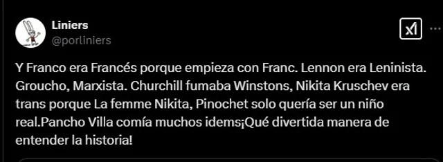 “Groucho (Marx), era marxista. Churchill fumaba Winstons, Nikita Kruschev era trans porque ‘La femme Nikita’, Pinochet solo quería ser un niño real y Pancho Villa comía muchos ídems ¡Qué divertida manera de entender la historia!”, ironizó el dibujante.