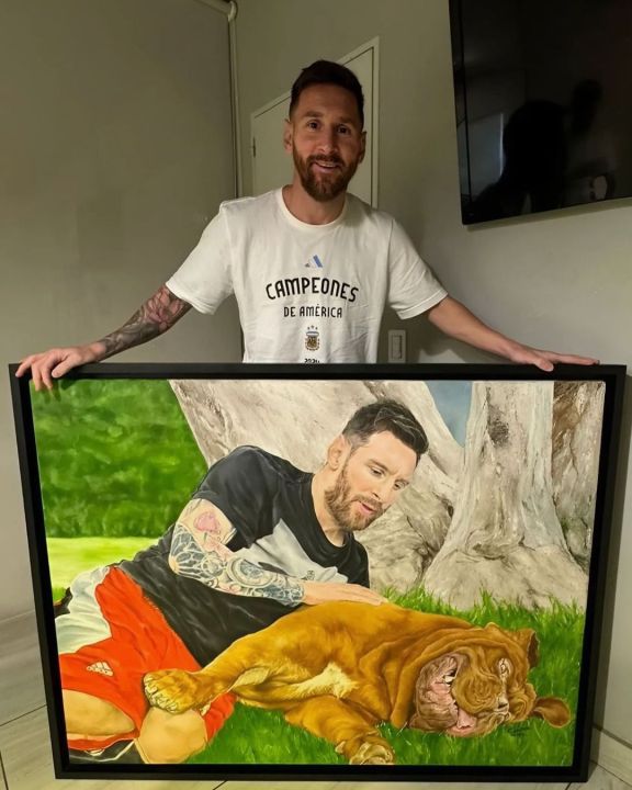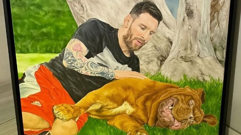 ¡Lionel Messi recibió un increíble regalo! El retrato a mano de él junto a su gigante perro en un cuadro