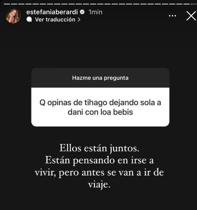 “Están pensando en irse a vivir, pero antes se van a ir de viaje”, reveló luego Estefi sobre Thiago y Daniela, desde las historias de su cuenta oficial de Instagram.
