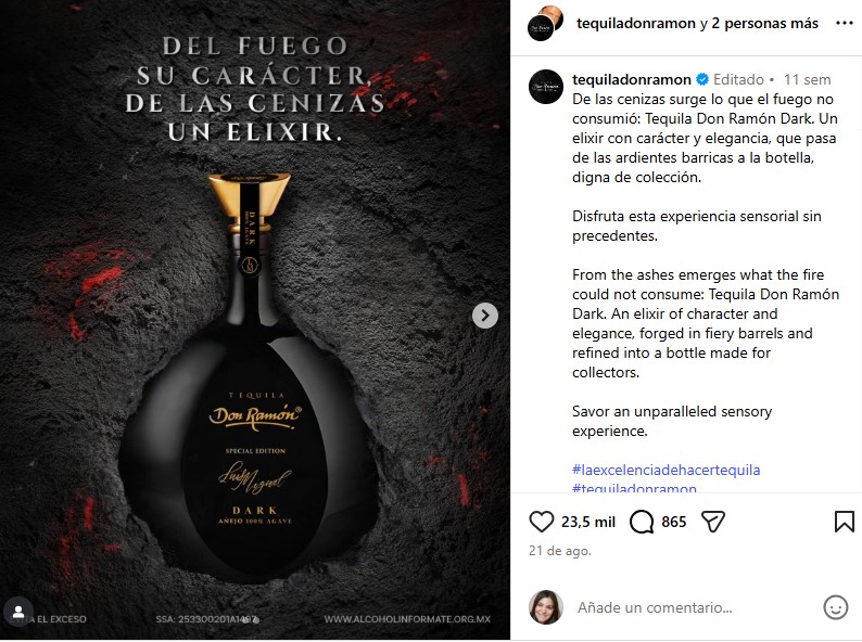 «De las cenizas surge lo que el fuego no consumió: Tequila Don Ramón Dark. Un elixir con carácter y elegancia, que pasa de las ardientes barricas a la botella, digna de colección. Disfruta esta experiencia sensorial sin precedentes», escribió en su promoción.