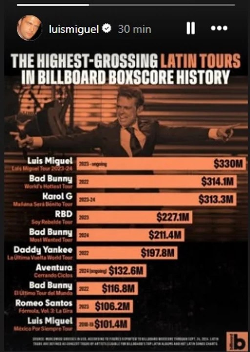 El “Luis Miguel Tour” que se llevó a cabo entre el 3 de agosto de 2023 y el 18 de diciembre de 2024 con producción de Fenix Entertainment, sigue consiguiendo nuevos récords. Según reveló el cantante en sus redes sociales, recaudó 330 millones de dólares, quedando en el primer puesto de “The Highest-Grossing Latin Tours In Billboard Boxscore History”.