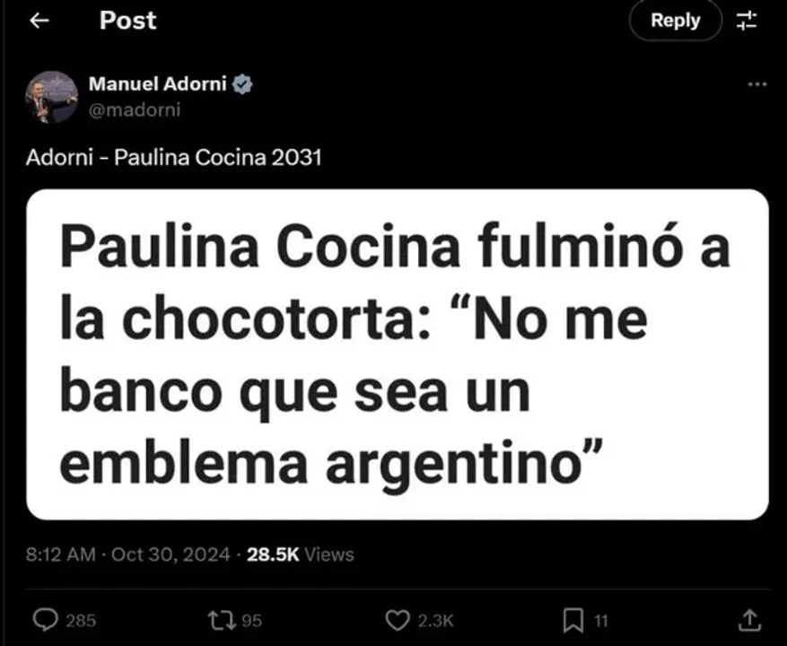 La cocinera e influencer argentina Paulina Cocina estuvo ayer en el programa de streaming “Gelatina” y criticó a al chocotorta. Ahora, el vocero presidencial, Manuel Adorni, salió a apoyarla en X con una imagen del recorte de los dichos de Paulina y comentó “Adorni- Paulina Cocina 2031”, para mostrar que coincide con la opinión de la cocinera sobre la chocotorta, por lo que bromeó con una fórmula electoral con ella.