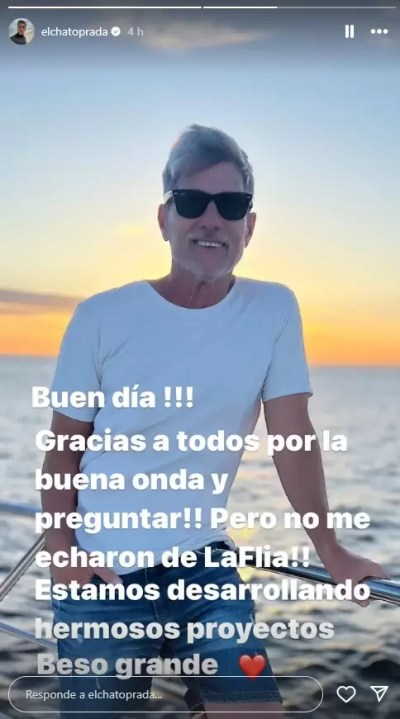 Según la información publicada por el sitio de noticias Big Bang News, el Chato Prada aclaró todo en un posteo: «Buen día. Gracias a todos por la buena onda. y preguntar, pero no me echaron de LaFlia. Estamos desarrollando hermosos proyectos. Beso grande», escribió Prada en una historia de Instagram. La negativa estuvo orientada a la afirmación que había hecho el domingo el periodista de espectáculos Nacho Rodríguez, quien había afirmado la desvinculación en su cuenta de X (ex Twitter).