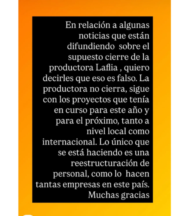 «En relación a algunas noticias que están difundiendo sobre el supuesto cierre de la productora Laflia, quiero decirles que eso es falso», fue lo primero que expresó en dicha publicación.