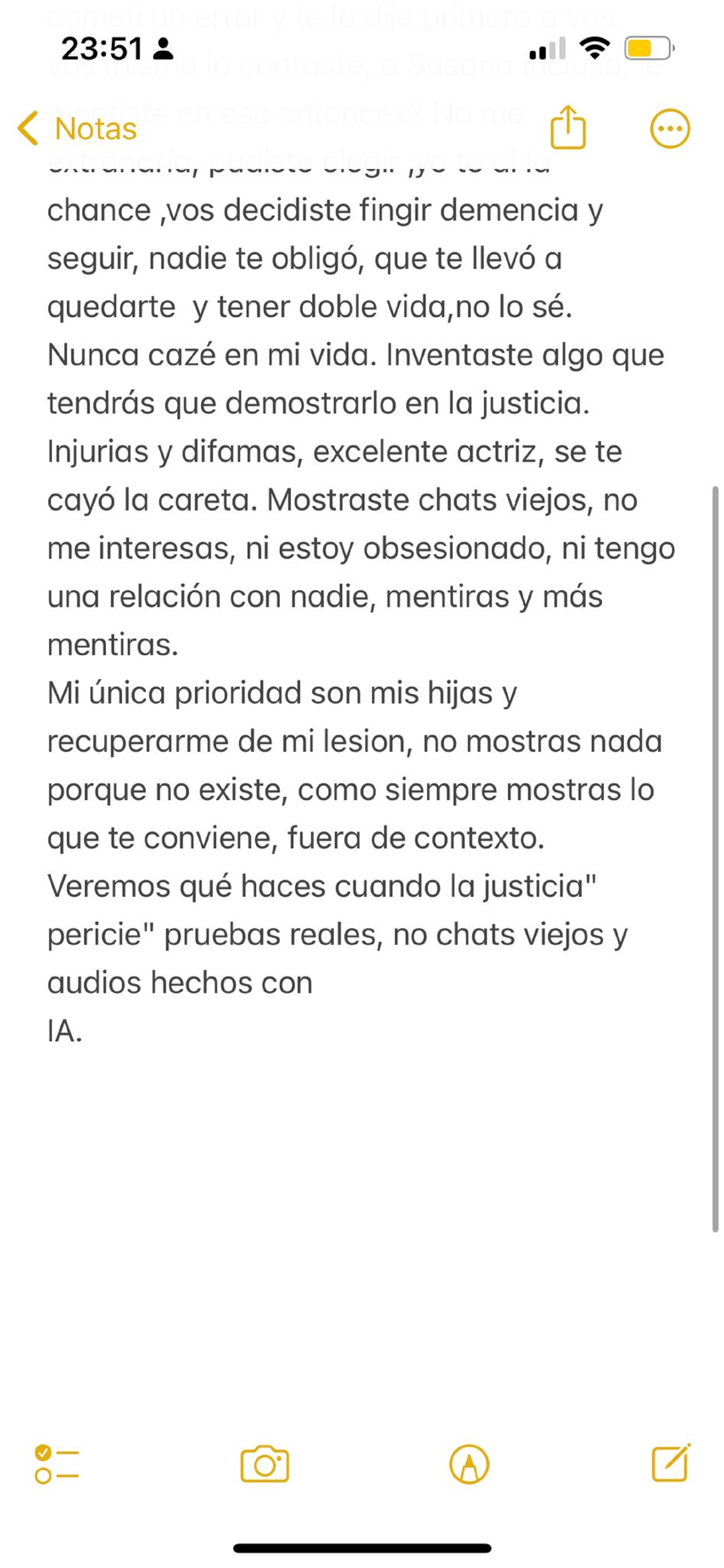 Finalmente, respecto de lo mencionado por Wanda Nara sobre sus habilidades para cazar, Icardi desmintió a su expareja. «Nunca cacé en mi vida. Inventaste algo que tendrás que desmentirlo en la Justicia. Injuriás y difamás. Excelente actriz. Se te cayó la careta«, concluyó Mauro Icardi.