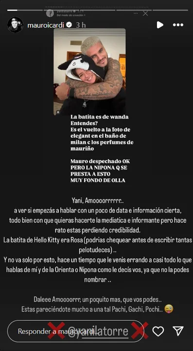 Icardi desmintió la información de la periodista, quien habia señalado que la China estaba usando la ropa que Wanda dejo en Turquía: «La batita de Hello Kitty era rosa (podrías chequear antes de escribir tantas pelotudeces) y no va sólo por esto, hace un tiempo que le venís errando a casi todo lo que hablás de mi o de la oriental o nipona como le decís vos, ya que no la podés nombrar. Dale amooorrrr, un poquito más que vos podés. Estás pareciendote a una tal Pachi, Gachi, Pochi😜», escribió.