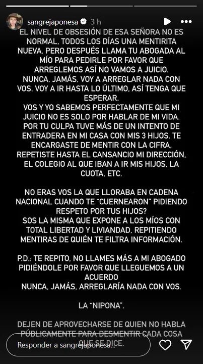 Y firmó: “La ‘nipona’. Dejen de aprovecharse de quien no habla públicamente para desmentir cada cosa que se dice”.