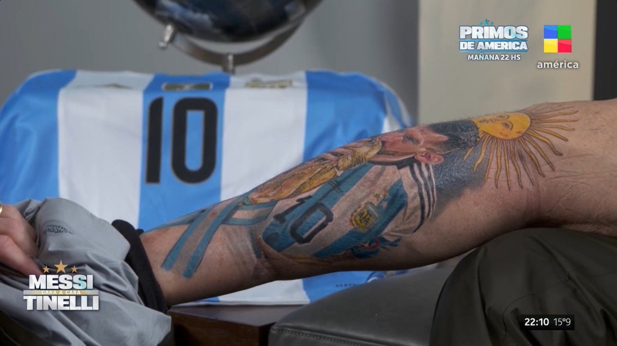 «Esta es tu cara, que va a estar en mi cuerpo por el resto de mi vida» le contó Tinelli, advirtiendo previamente que se lo hizo un amigo de Nuñez, pocos días antes de llegar a Estados Unidos. «Que locura», respondió el 10 y se quedó unos segundos mirando el tatuaje, impresionado.