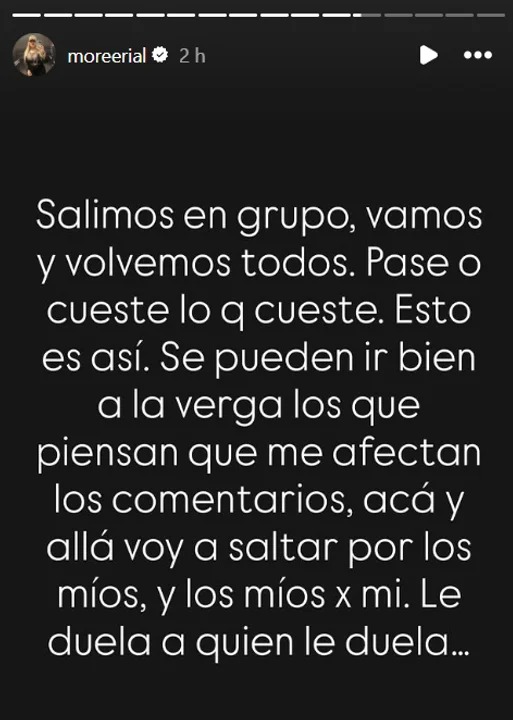 Y luego, profundizó sobre el hecho, justificando sus actos: “Salimos en grupo, vamos y volvemos todos. Pase o cueste lo que cueste. Esto es así. Se pueden ir bien a la verga los que piensan que me afectan los comentarios, acá y allá voy a saltar por los míos, y los míos x mi. Le duela a quien le duela…”.